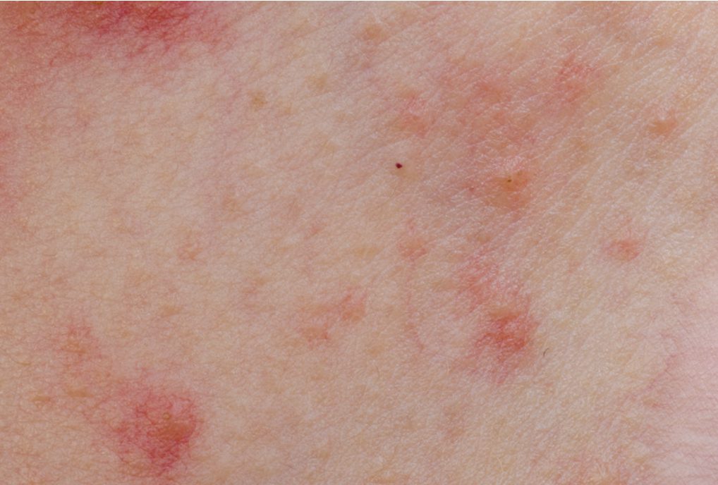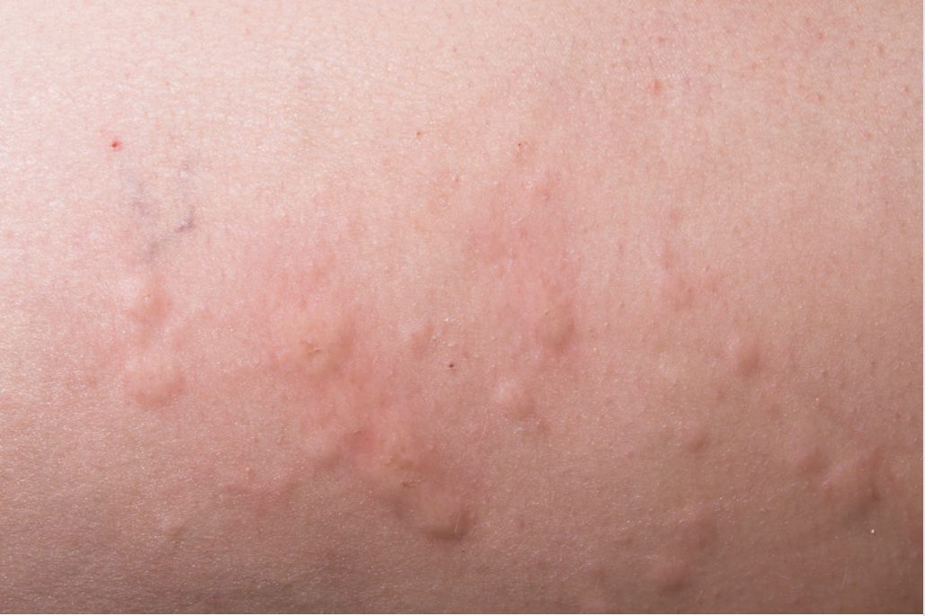 Hives can appear as round, red or pink welts and they may be either small or large. They can either show up alone or in a big group. Hives usually last just a few hours and itch. Unlike eczema, they’re short-lived and should go away within 24 hours. However, new hives can show up too, which might continue for weeks or longer. They also differ in that they can cause swelling of your lips or other areas on your body where they are found.
